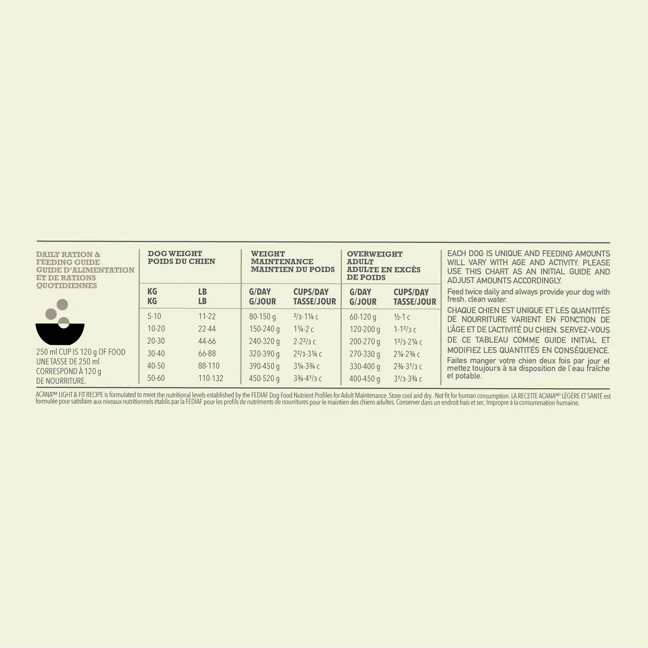Lorsqu’il s’agit de nourriture pour chiens ACANA, chaque ingrédient compte. C’est pourquoi notre recette Light & Fit a été soigneusement formulée pour soutenir un poids idéal chez les chiens de toutes races. Riche de 65 % d’ingrédients d’origine animale de qualité tels que du poulet frais et des os crus, équilibrée avec 35 % de fruits, de légumes et d’ingrédients à base de plantes, cette recette fournit une alimentation équilibrée qui satisfera votre chien et l’aidera à maintenir un poids santé. Avec ces ingrédients équilibrés et de haute qualité, chaque repas de la recette pour chiens Light & Fit d’ACANA ressemble à un repas directement acheté sur le marché.