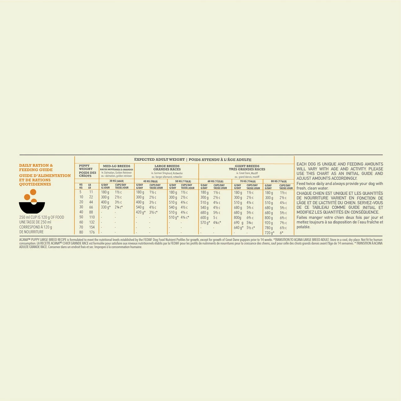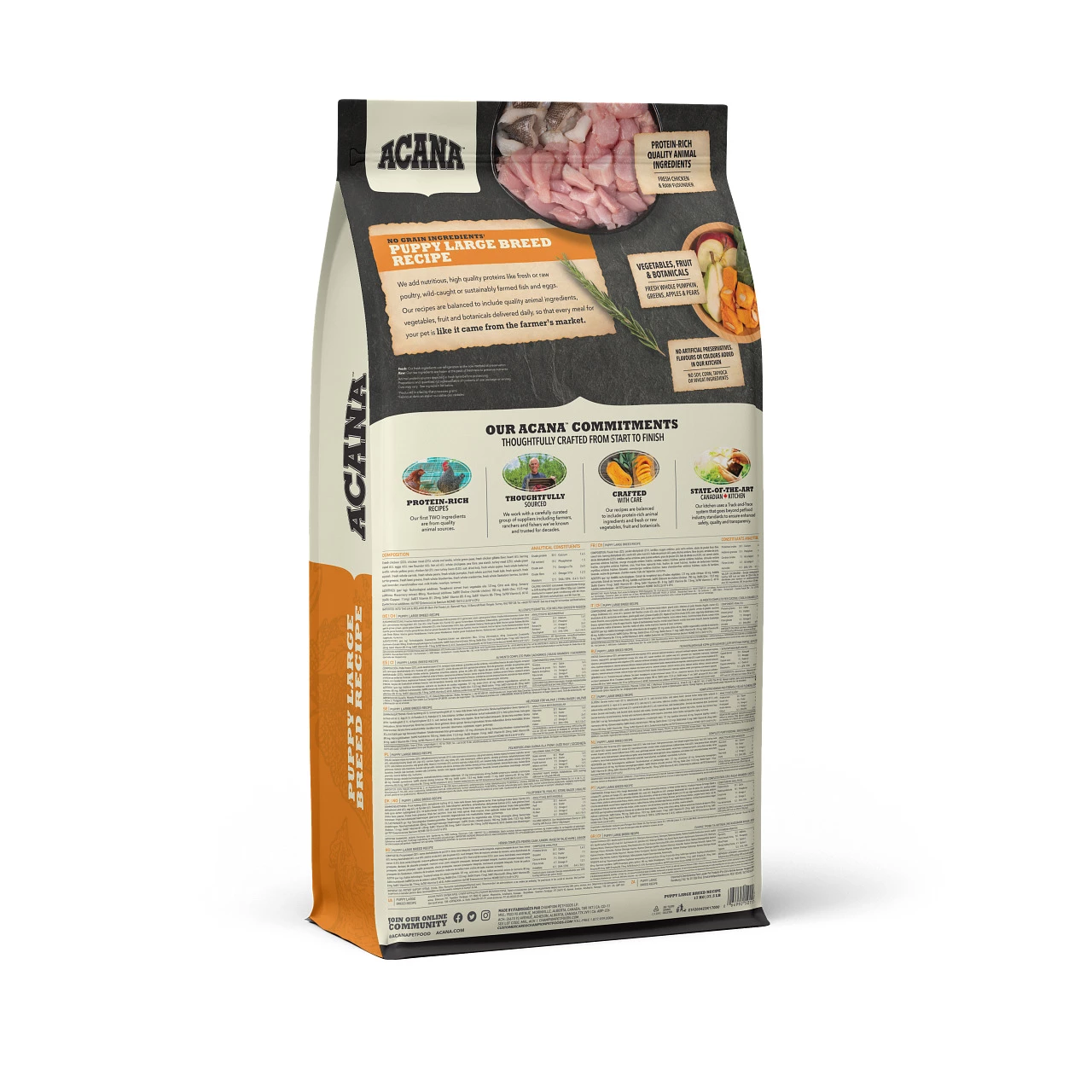 Lorsqu’il s’agit de nourriture pour chiots ACANAMD, chaque ingrédient compte, c’est pourquoi notre recette Puppy Large Breed a été soigneusement élaborée pour prendre soin de votre animal. Riche de 70 % d’ingrédients d’origine animale de haute qualité, comme du poulet frais, équilibrée avec 30 % de fruits, de légumes et d’ingrédients végétaux, cette recette fournit à votre chiot en pleine croissance les protéines et les éléments nutritifs dont il a besoin pour favoriser son développement rapide. Avec ces ingrédients équilibrés et de haute qualité, chaque repas de la recette pour chiots de grande race d’ACANA ressemble à un repas directement acheté sur le marché.