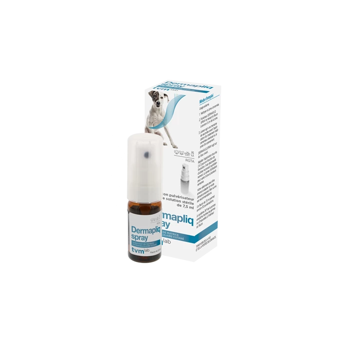 Dermapliq du laboratoire TVM est une solution stérile à usage externe formulée à base de matrice extracellulaire (RGTA) et destinée à favoriser la cicatrisation de la peau du cheval, la protéger et participer à la diminution de la douleur.