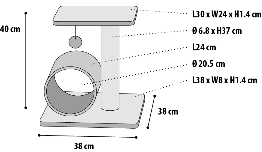 Arbre à chat pour chatons et chats de petites races. Sur la plateforme inférieure se trouve un baril recouvert de peluche et sur la plateforme supérieure se trouve une plateforme souple où votre chat peut se reposer avec une balle pour jouer davantage.