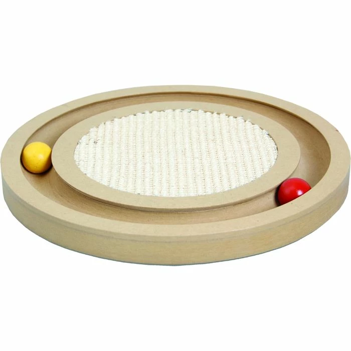 Le Scratch Board Infinity est fabriqué en bois et comporte également une couche de sisal où le chat peut faire ses griffes. Il y a également un rail dans lequel 2 balles ont été placées pour que le chat puisse jouer gentiment.