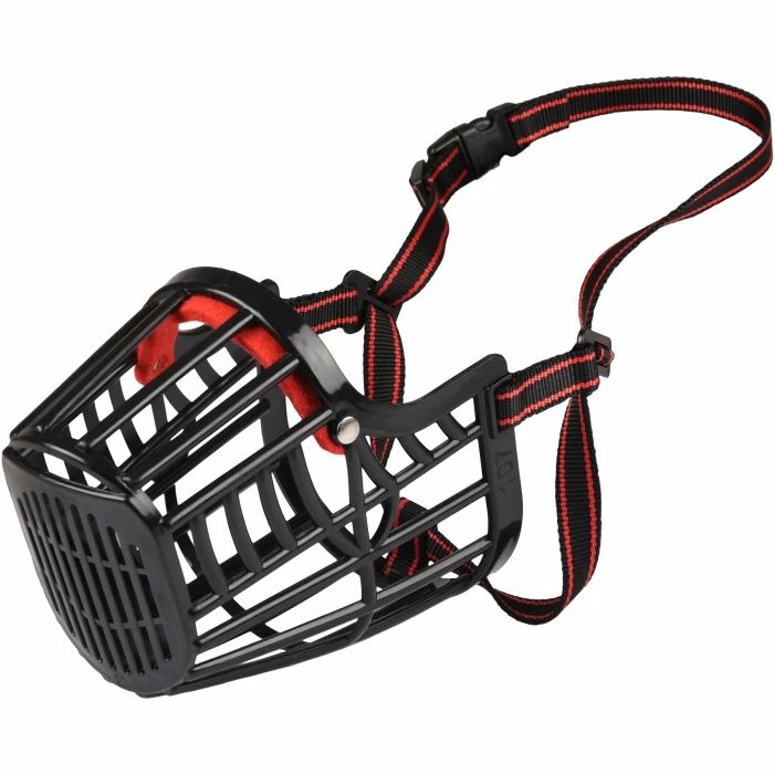 Muselière pour chien en plastique. Elle est dotée de sangles souples autour de la bouche pour plus de confort, elle est réglable sur la tête derrière les oreilles et possède des trous de ventilation suffisants pour une oxygénation normale.