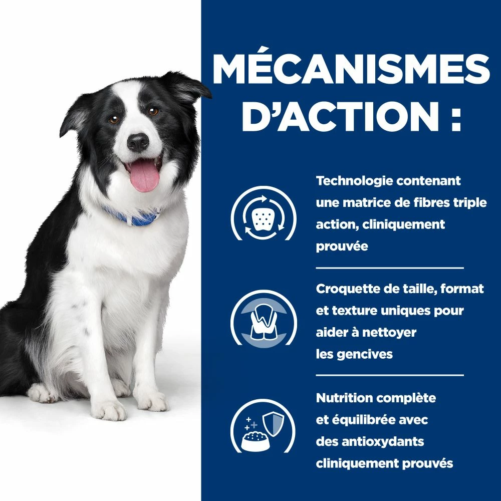 Les croquettes HILL’S CANINE T/D de la gamme Prescription Diet sont un aliment à teneur augmentée en fibres, et dont les caractéristiques mécaniques permettent une réduction de la plaque dentaire, du tartre et des tâches.