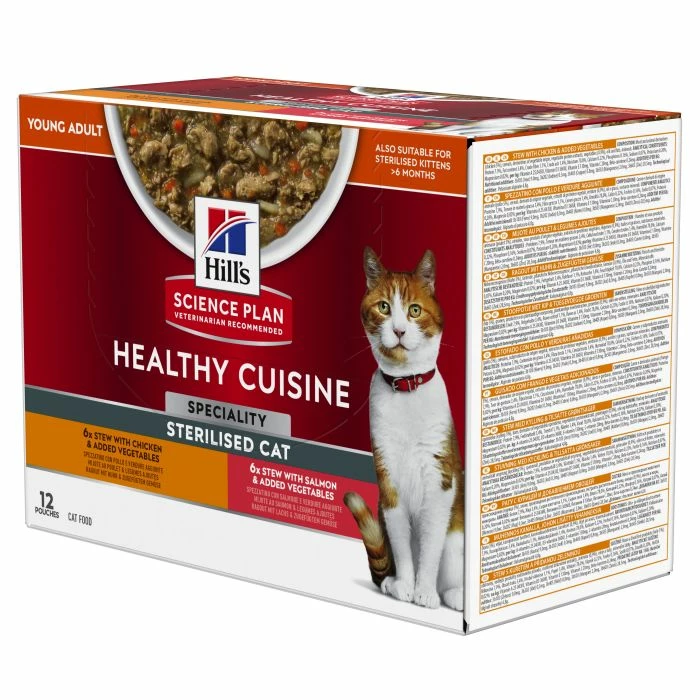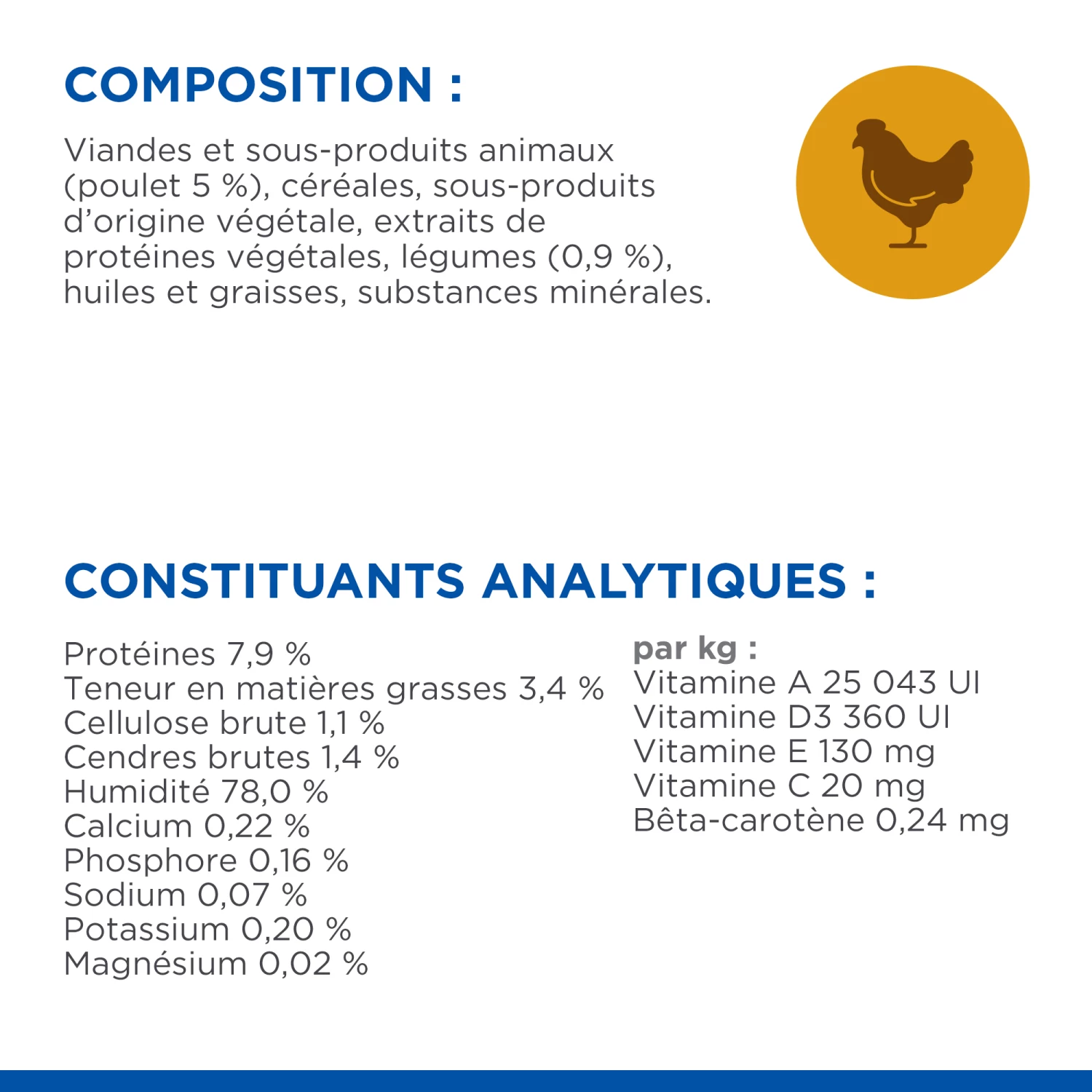 Hill’s Science Plan Healthy Cuisine fournit une alimentation saine et 100% équilibrée tout en offrant un goût irrésistible que votre chat adorera. Fabriqué avec des ingrédients de haute qualité. Des protéines de haute qualité pour la masse musculaire et des antioxydants pour soutenir le système immunitaire. Les mijotés Science Plan Healthy Cuisine peuvent être donnés seuls, mélangés à de l’alimentation sèche ou utilisés comme une garniture savoureuse pour plaire à votre chat. Aide à l’hydratation de votre animal*. *Veuillez fournir de l’eau fraîche à votre animal à tout moment.