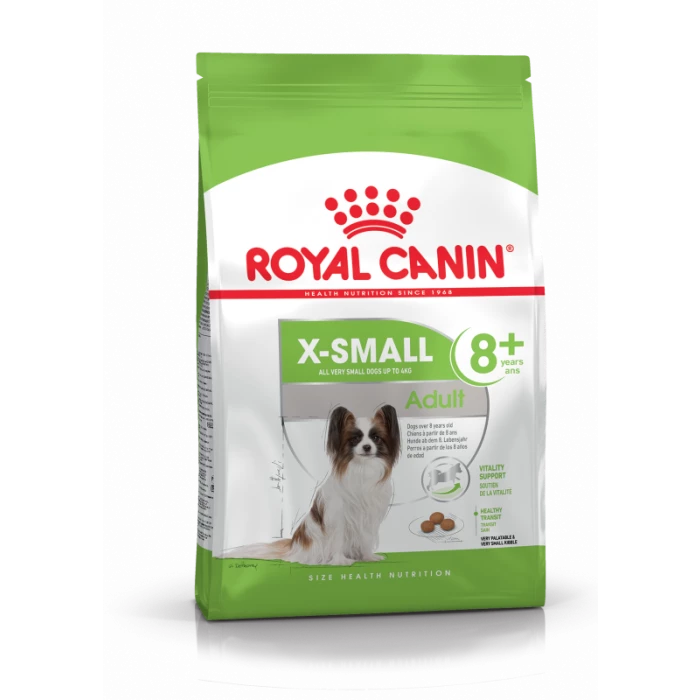 ROYAL CANIN® X-Small Adult 8+ est spécialement formulé pour répondre à tous les besoins nutritionnels de votre petit chien adulte, et convient aux très petits chiens de plus de 8 ans qui pèsent jusqu’à 4 kg.