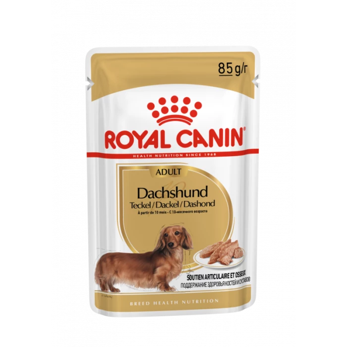 ROYAL CANIN® Dachshund in Loaf (en mousse) est spécialement formulé pour répondre à tous les besoins nutritionnels de votre chien adulte afin de favoriser sa bonne santé et son bien-être général et convient aux Teckels de plus de 10 mois.
