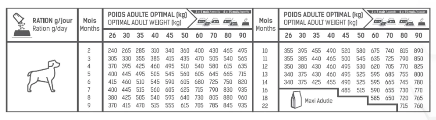 Une énergie métabolisable raisonnée, un apport en calcium et phosphore modéré en font l’aliment de choix pour les chiots de grande taille qui nécessitent une croissance lente et contrôlée.