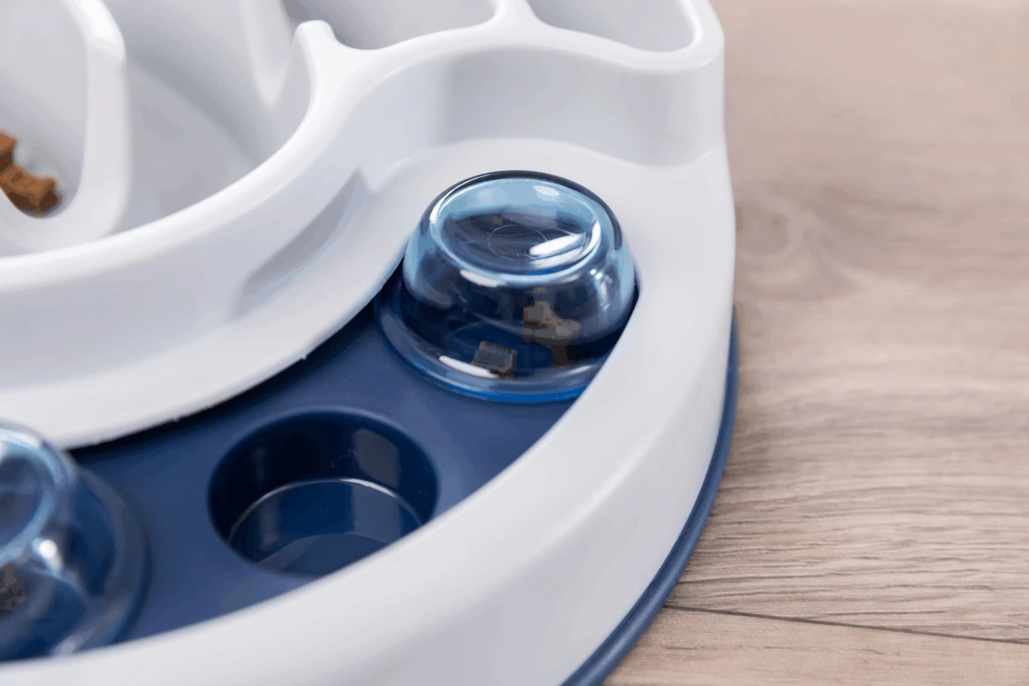 Le jeu consiste en un labyrinthe avec des renfoncements sur les côtés où vous pouvez cacher les croquettes ou les friandises sous un couvercle. Au final, votre chien est stimulé, il mange plus lentement et moins, ce qui contribue à une digestion saine et à un poids idéal.